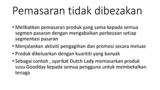 Membahagikan pasaran kpd kumpulan2 tertentu y mempunyai keperluan ciri gelagat tertentu y mungkin memerlukan campuran pemasaran.